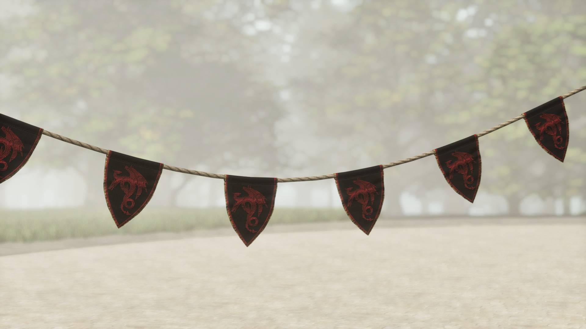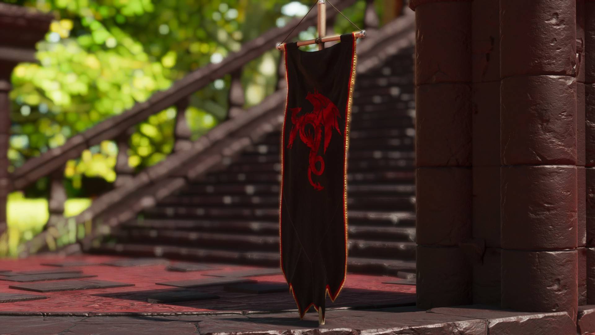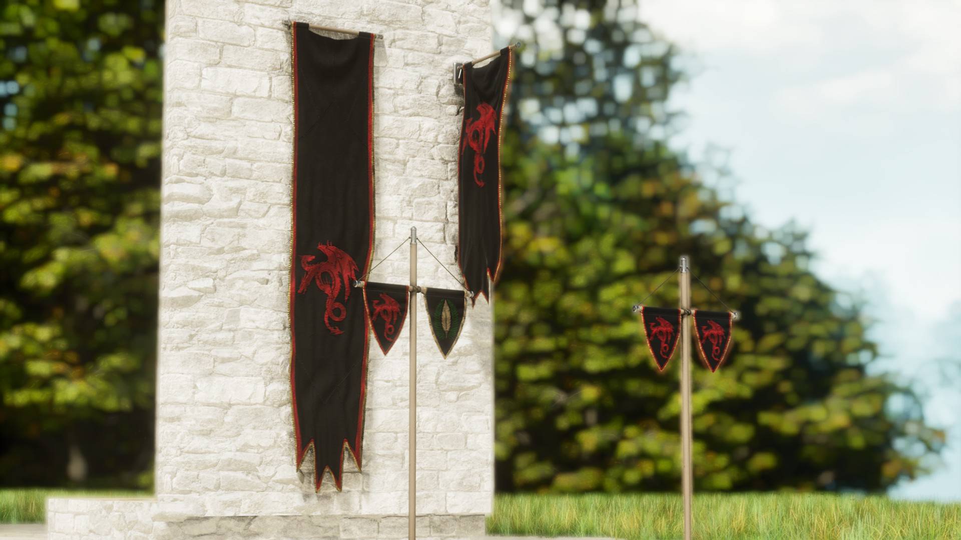 A variety of dragon themed banners, furniture, and decorations