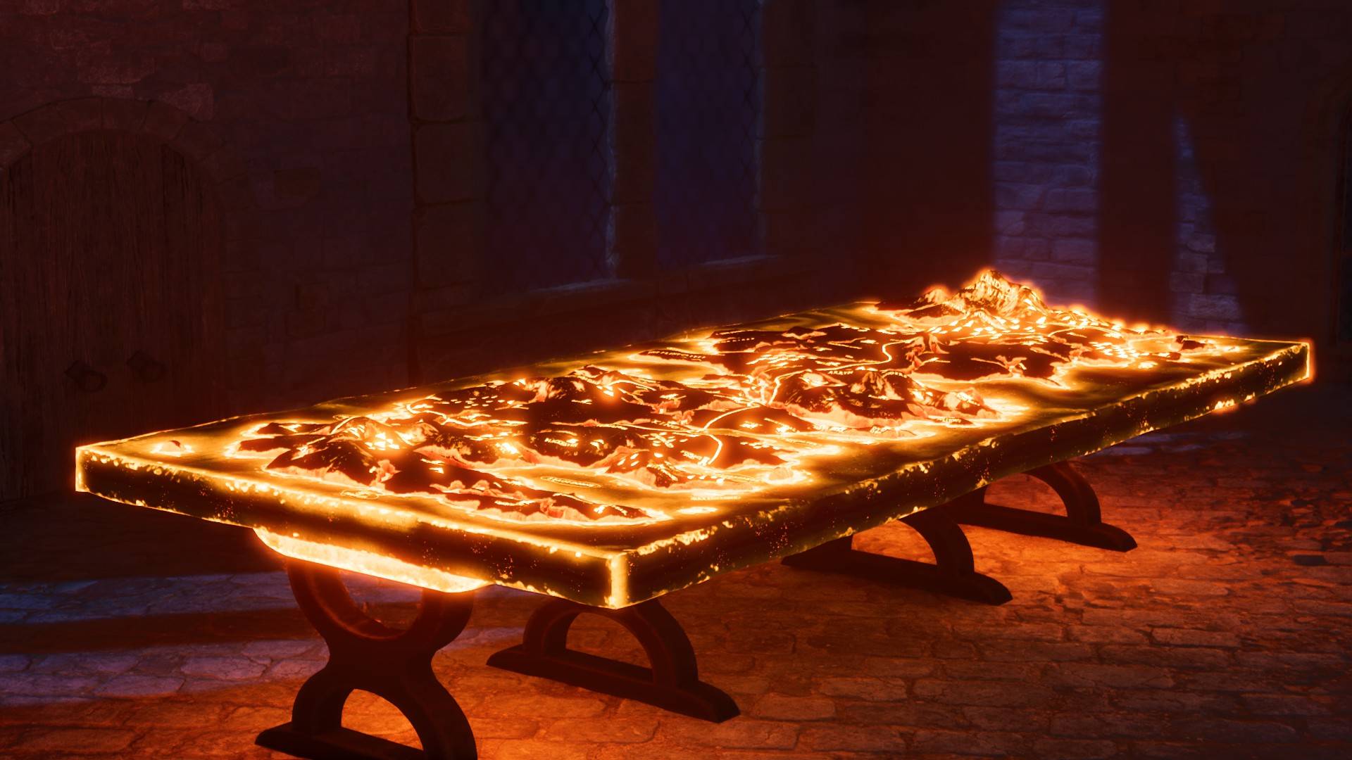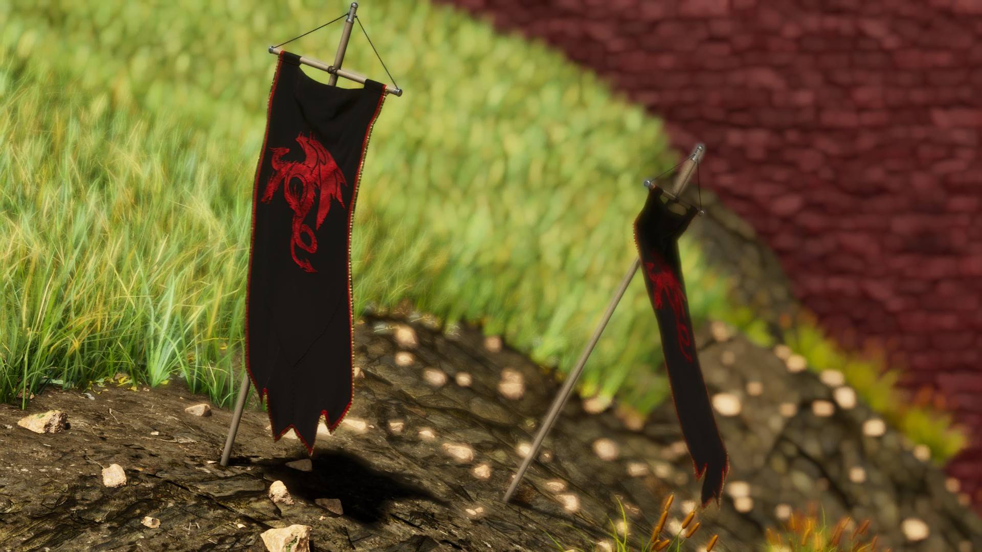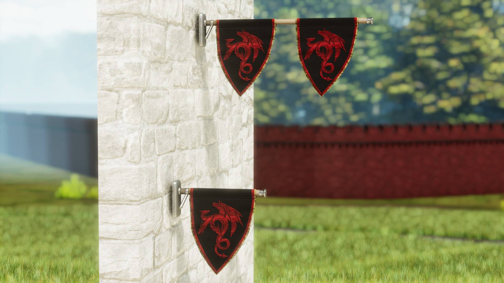 A variety of dragon themed banners, furniture, and decorations