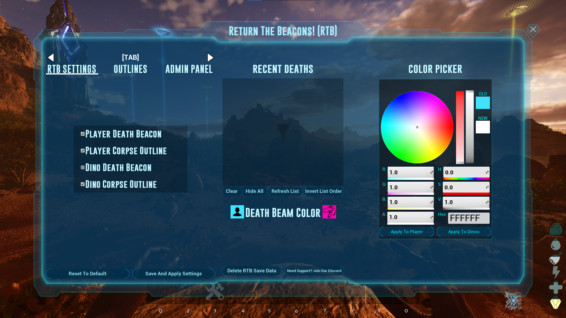 Adds Customizable Death Beams and Outlines. Effective for locating your dead corpses and caches. Also works for dinos!
