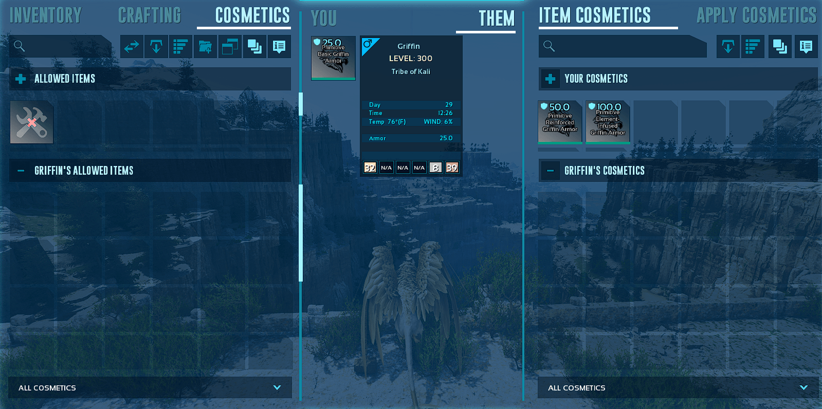 Adds three tiers of natural armor for your griffin! Basic, Reinforced, and Element-Infused Armor. Goes into the Cosmetic slot.