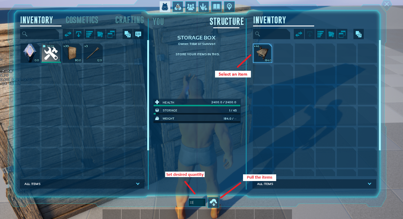 Pull or transfer items between containers.