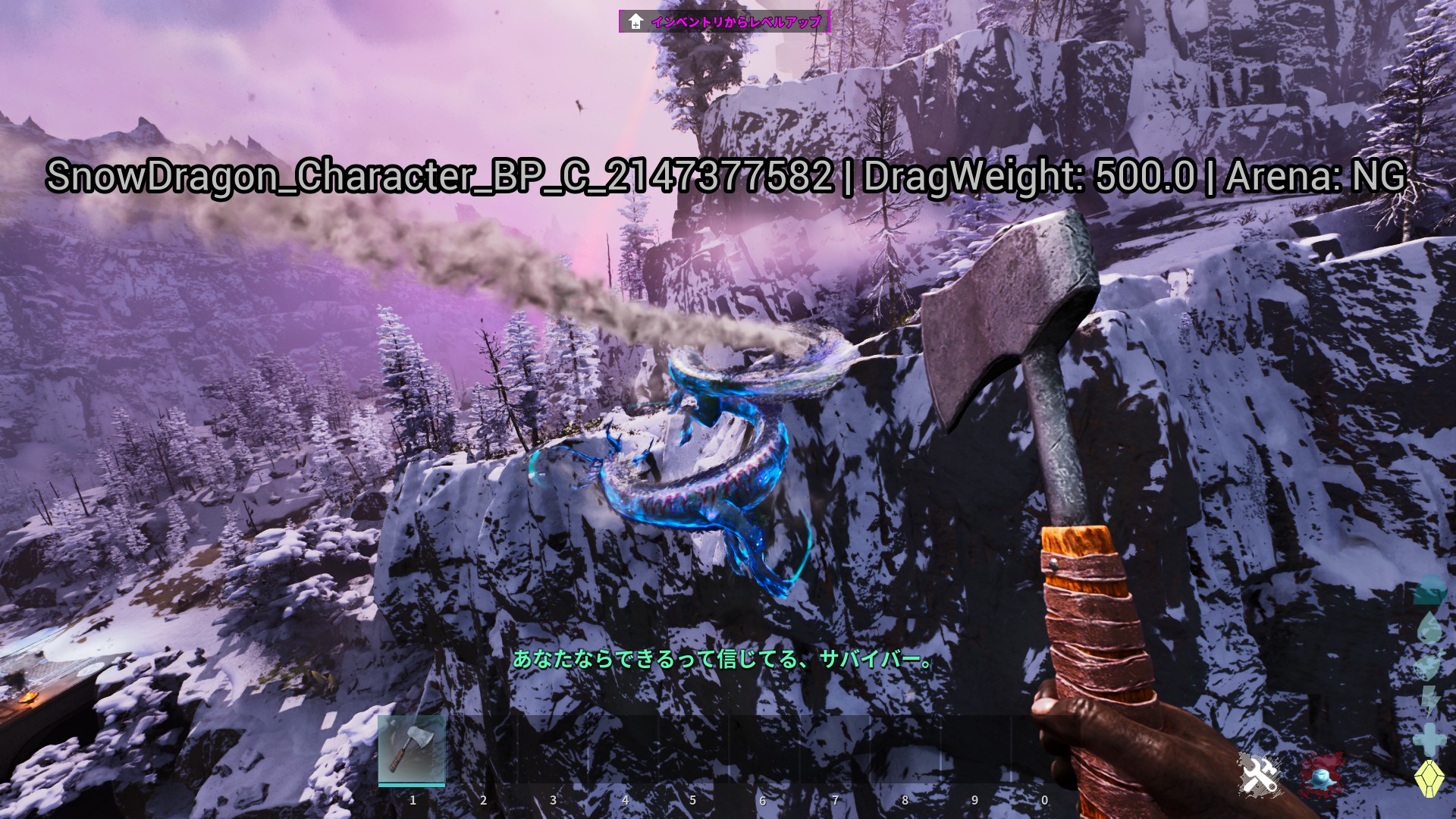 This feature allows players to inspect the internal Drag Weight of any creature in real-time. By aiming a specific tool (such as a hatchet) at a dino, the mod retrieves and displays its precise name and weight data on the screen.