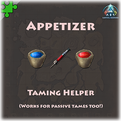 Taming helper. Tranq dart works on passive tames, tame creatures faster on 1x rates. Cosumables to lower food faster. Works underwater